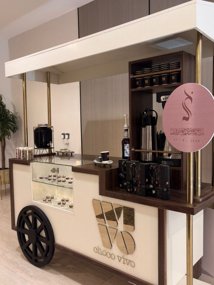 عربة أنيقة بتصميم عصري يجمع بين الفخامة والبساطة، مجهزة لتقديم القهوة والمشروبات الساخنة . مثالية للمناسبات والفعاليات،